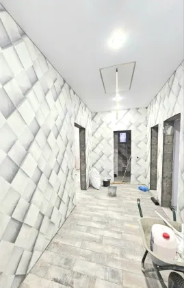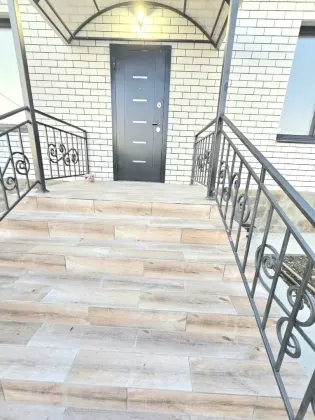 Площадь дома 75 кв.м. Ремонт выполнен в светлых тонах (под ключ): керамогранит, ламинат, обои, натяжные потолки, теплый пол. В доме 2 спальни, гостинная-кухня с выходом на террасу во дворе, санузел. Потолки - 3,1 м.