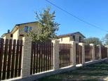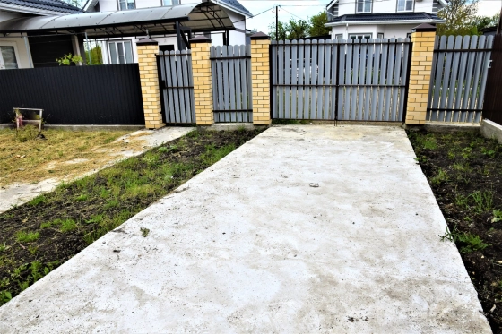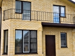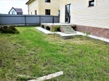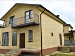Дом новый, построен на участке земли в 5 соток. Дом на высоком фундаменте облицован желтым кирпичем и декоративным камнем. Крыша - металлочерепица коричневого цвета. Забор из евроштакетника. Все дорожки вокруг дома, от калитки до порога забетонированы. Есть вода и свет (15 кВт). Газа нет. Канализация - септик. Завезена плодородная земля.