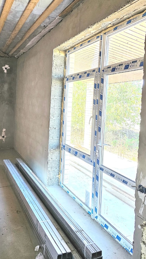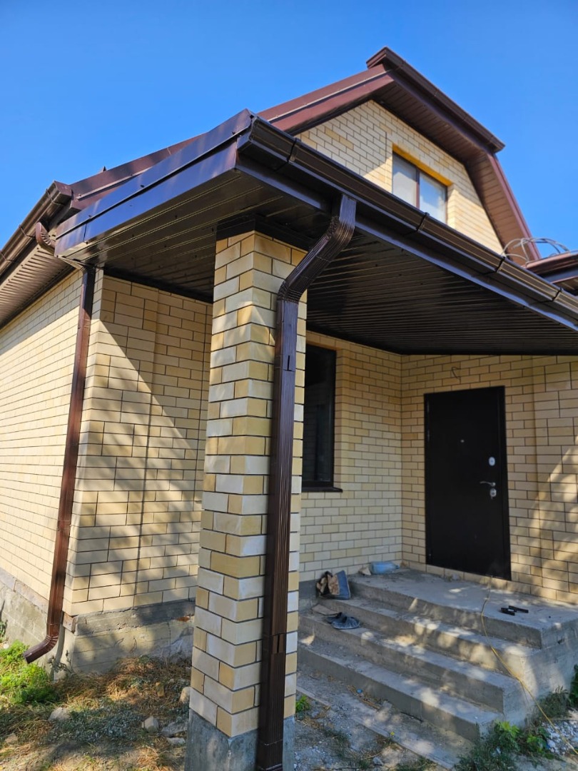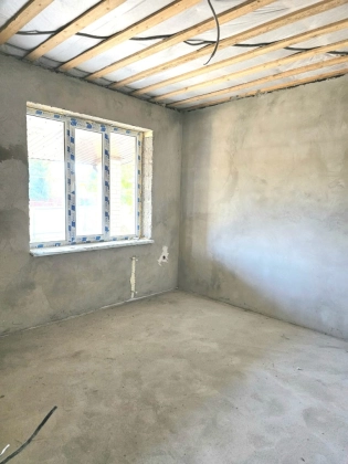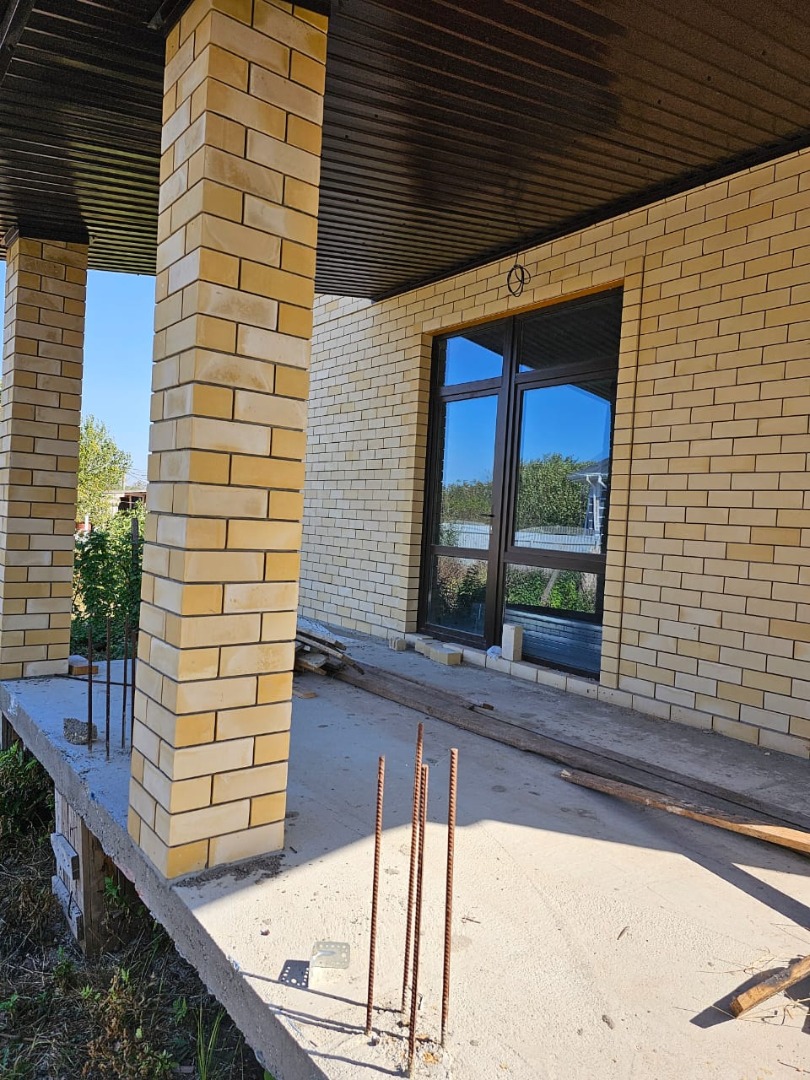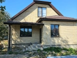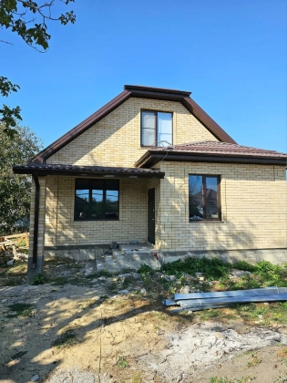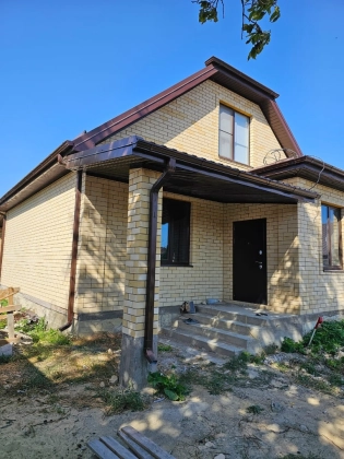 2-этажный дом новый, построен на участке земли в 4 сотках. Дом на высоком фундаменте. облицован желтым кирпичем. Стены из керамзитобетонных блоков, утеплены стены и крыша. Сверху металлочерепица. Есть вода и свет (15 кВт). Газ подведен к дому. Канализация - септик.