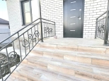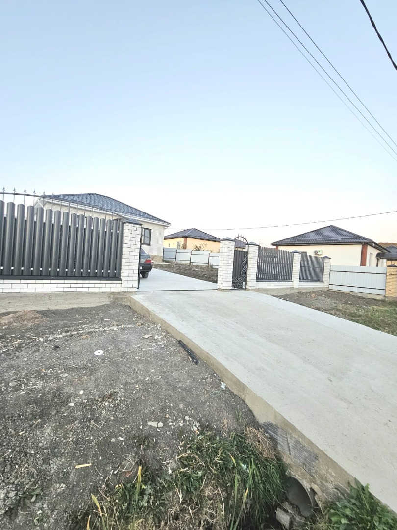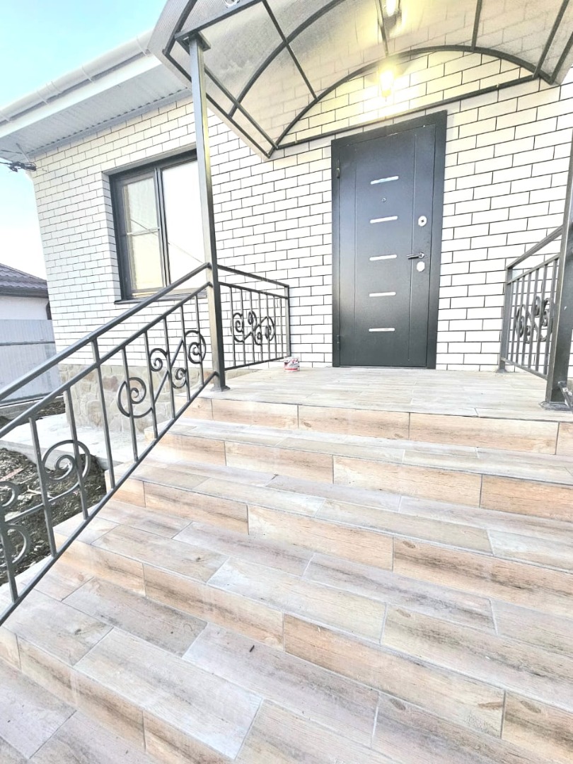 Дом новый, построен на участке земли в 8,5 соток. Дом на высоком фундаменте облицован белым кирпичем. Крыша - металлочерепица графитового цвета. Забор из металлопрофиля. Все дорожки вокруг дома, от калитки до порога забетонированы. Есть вода и свет (15 кВт). Газа нет. Канализация - септик. Завезена плодородная земля.