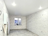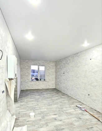 Площадь дома 75 кв.м. Ремонт выполнен в светлых тонах (под ключ): керамогранит, ламинат, обои, натяжные потолки, теплый пол. В доме 2 спальни, гостинная-кухня с выходом на террасу во дворе, санузел. Потолки - 3,1 м.