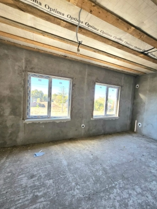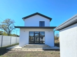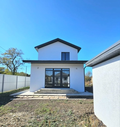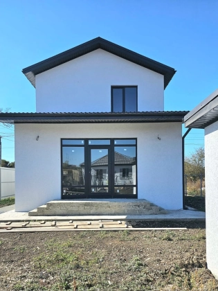 Дом новый, построен на участке земли в 6 соток. Дом на высоком фундаменте. Крыша - металлочерепица графитового цвета. Забор из металлопрофиля. Все дорожки вокруг дома, от калитки до порога забетонированы. Есть вода и свет (15 кВт). Газ доведен до дома. Канализация - септик (16 м2).