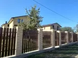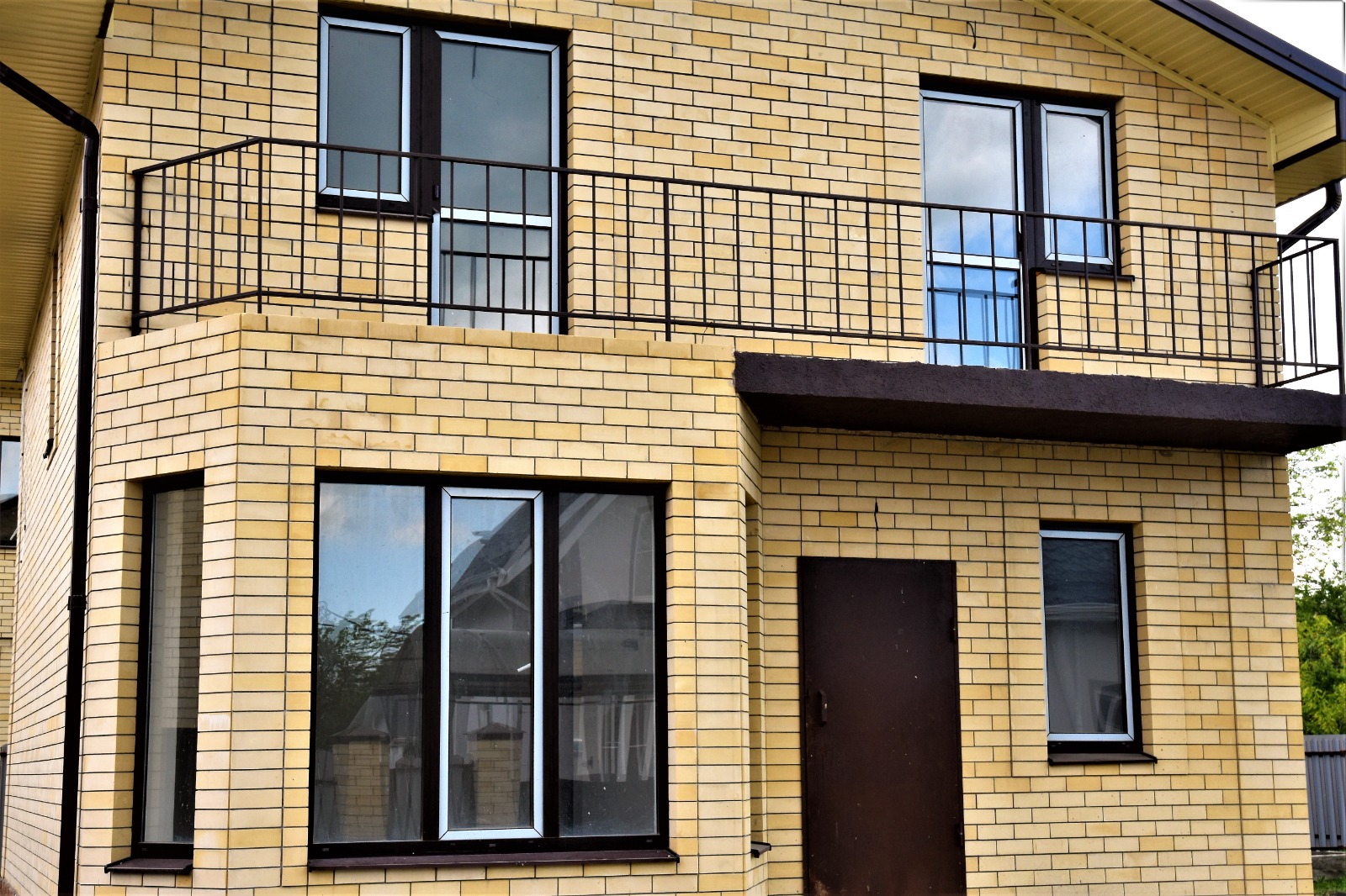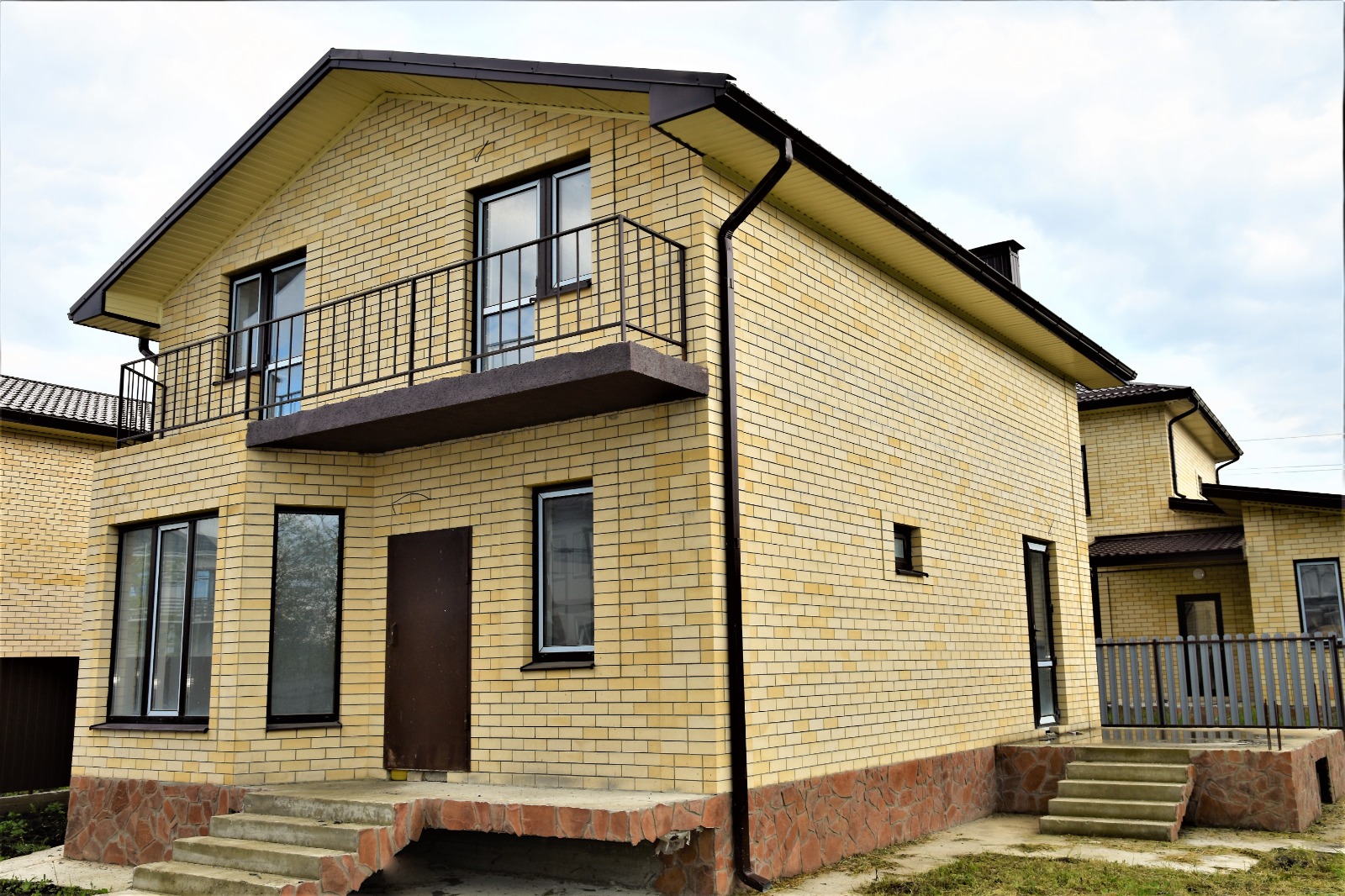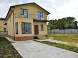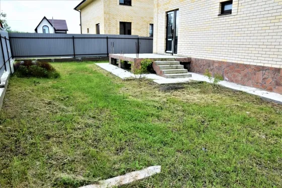 Дом новый, построен на участке земли в 5 соток. Дом на высоком фундаменте облицован желтым кирпичем и декоративным камнем. Крыша - металлочерепица коричневого цвета. Забор из евроштакетника. Все дорожки вокруг дома, от калитки до порога забетонированы. Есть вода и свет (15 кВт). Газа нет. Канализация - септик. Завезена плодородная земля.