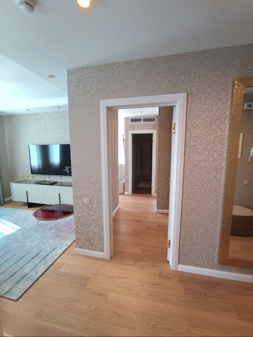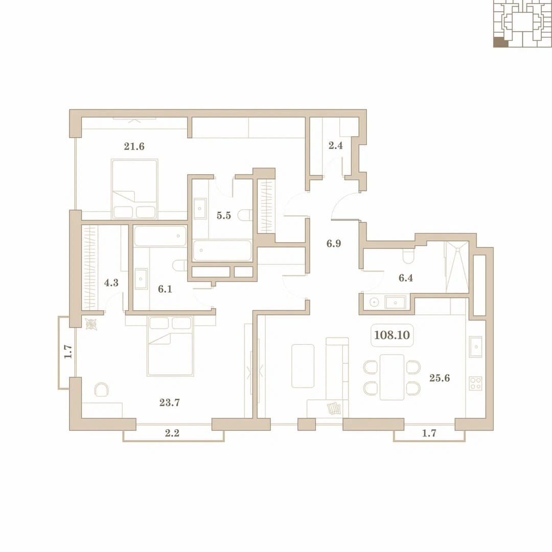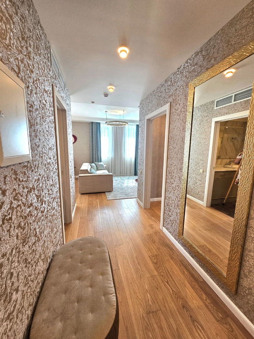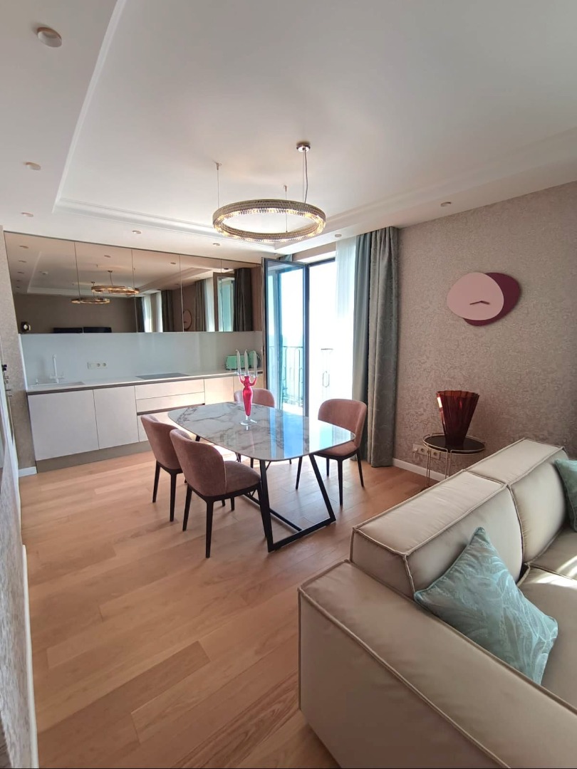 Трехкомнатная элитная квартира на самом берегу Черного моря. Апартаменты на 3 этаже, площадью 108,1 кв.м. Гостинная с кухней - 25,6 кв.м, 2 спальни - 23,7 кв.м и 21,6 кв.м, три туалетных комнаты - 6,4 кв.м, 6,1 кв.м , 5,5 кв.м (с ваннами). Также имеются гардеробная - 4,3 кв.м и три балкона (с видом на море). Апартаменты продаются в чистовой отделке: паркетная доска на полу и керамогранит, обои под покраску, туалетные комнаты полностью оборудованы.