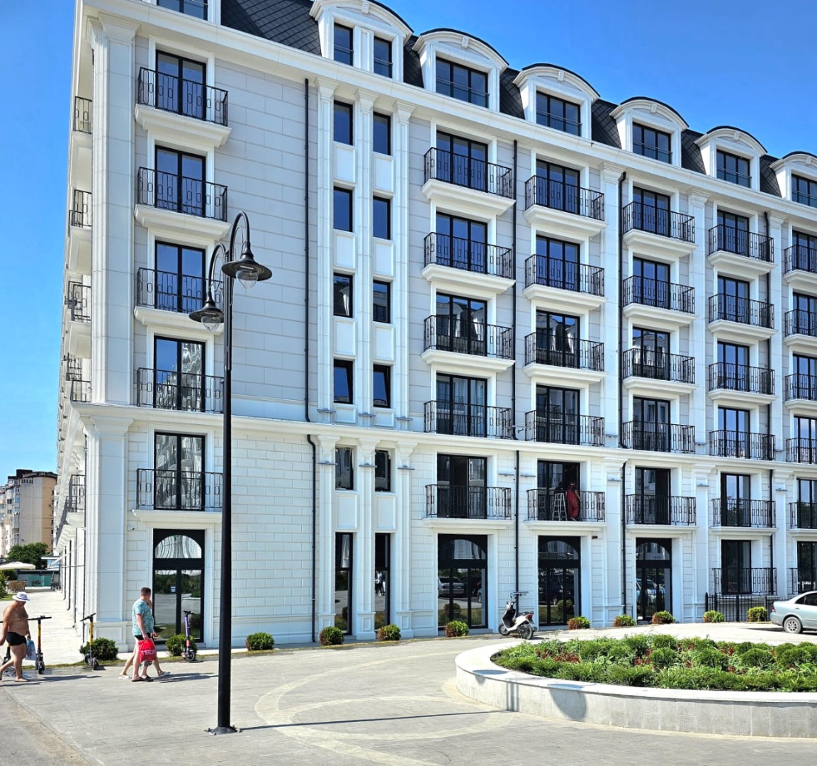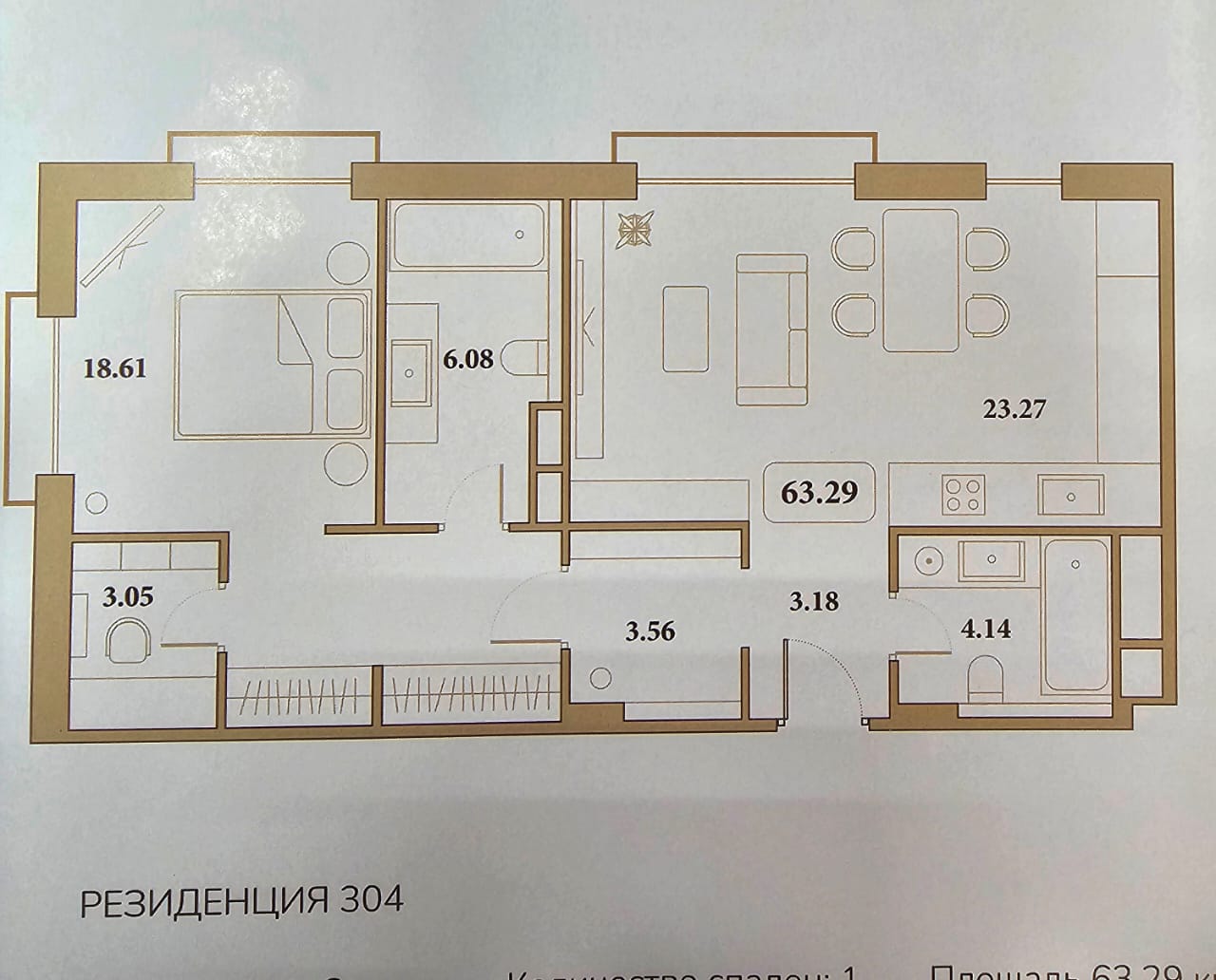 2-комнатные апартаменты находятся на 3 этаже, площадью 68,9 кв.м. Гостинная с кухней - 25,3 кв.м, спальня - 18,6 кв.м, три туалетных комнаты - 6,08 кв.м, 4,14 кв.м и 3,05 кв.м, три балкона. Апартаменты продаются в чистовой отделке: паркетная доска на полу и керамогранит, обои под покраску, туалетные комнаты с сантехникой.