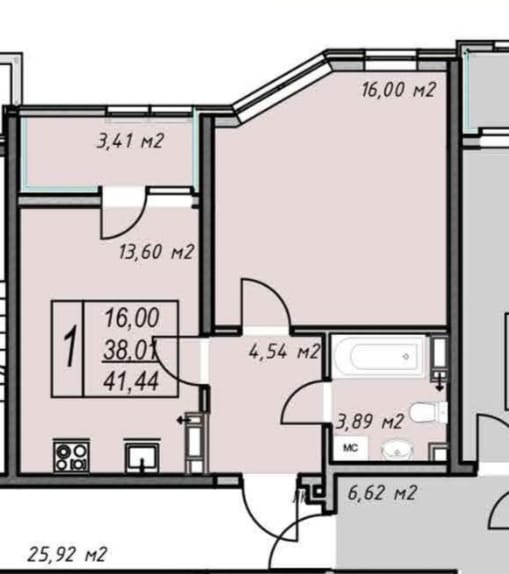 Квартира расположена на 12 этаже 14 этажного дома, площадью 42 кв.м. жилая комната - 16 кв.м., кухня 13,6 кв.м с выходом на лоджия 3,41 кв.м.