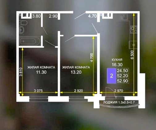 Квартира комфорт-класса находится на 5 этаже монолитного дома. Площадь квартиры 52,9 кв.м, кухня - 16,3 кв.м, две жилые комнаты - 13,2 кв.м.и 11,3 кв.м Отделка - предчистовая: оштукатуренные стены, стяжка пола, проведена электроразводка. выведены розетки. Все коммуникации центральные.