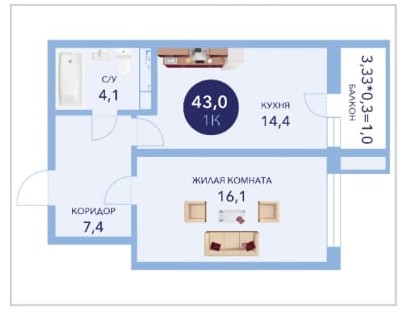 Квартира комфорт-класса находится на 7 этаже монолитного дома. Площадь квартиры 43 кв.м, кухня - 14,4 кв.м, комнаты - 16,1 кв.м, санузел - 4,1 кв.м, прихожая - 7,4 кв.м. Отделка - предчистовая: оштукатуренные стены, стяжка пола, проведена электроразводка, выведены розетки. Есть балкон из кухни. Все коммуникации центральные.