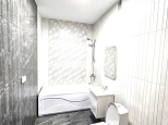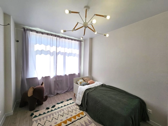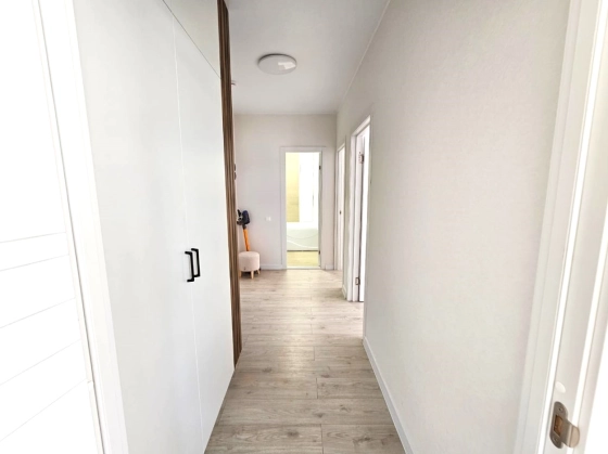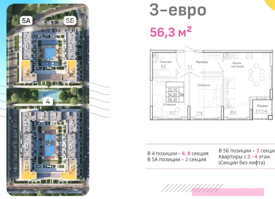 3-комнатная квартира-евро находится на 3 этаже. Общая площадь квартиры 56,3 кв.м, жилая - 23,1 кв.м, кухня-гостиная - 20,4 кв.м, две спальни - 11,7 кв.м и 11,4 кв.м, санузел - 4,3 кв.м, коридор -7,1 кв.м. Квартиры  продаются с отделкой в светлых тонах из качественных материалов. Есть открытая терраса (2,7 кв.м) с французскими оками из кухни. Вид из окна на горы и паркинг. Вода из собственной скважины. Отопление электрическое от собственной электрической подстанции.