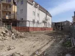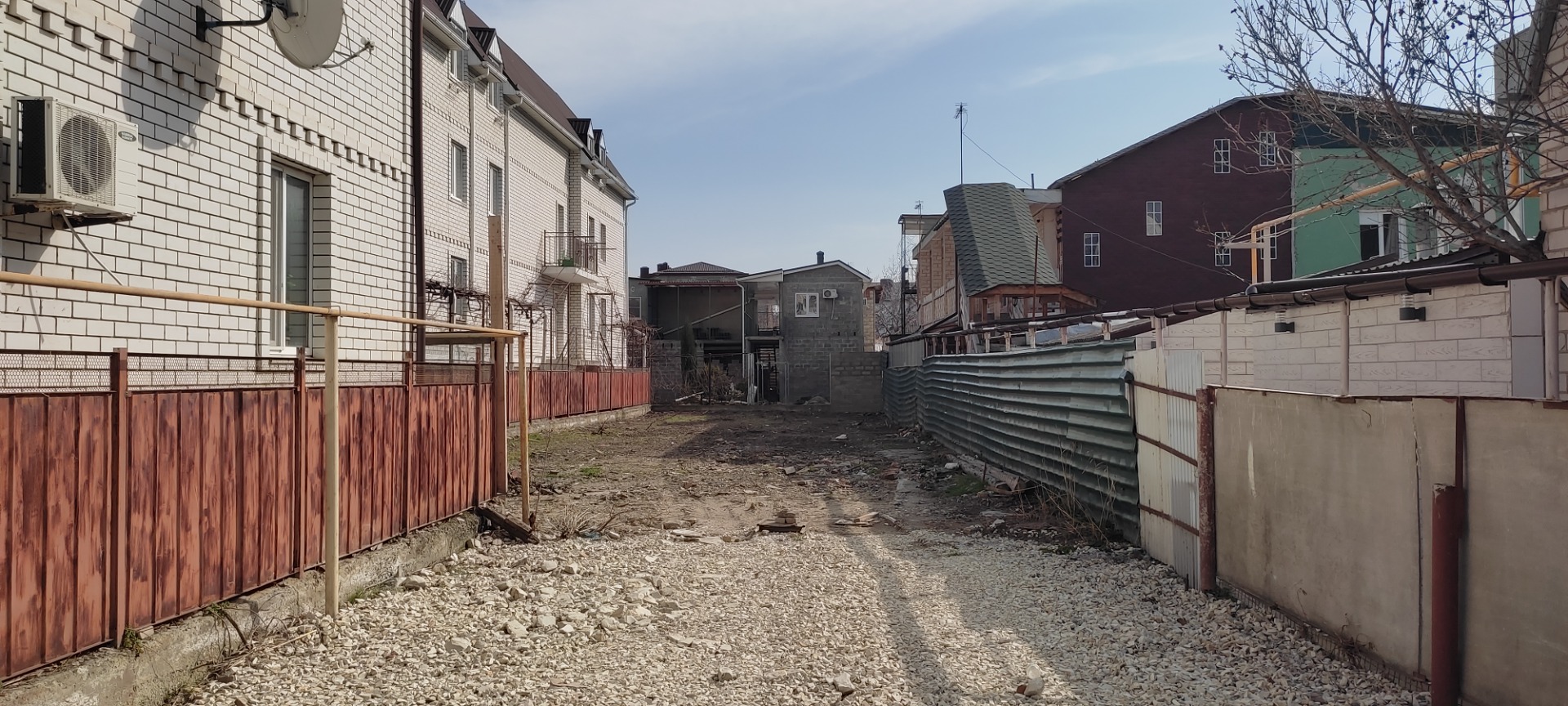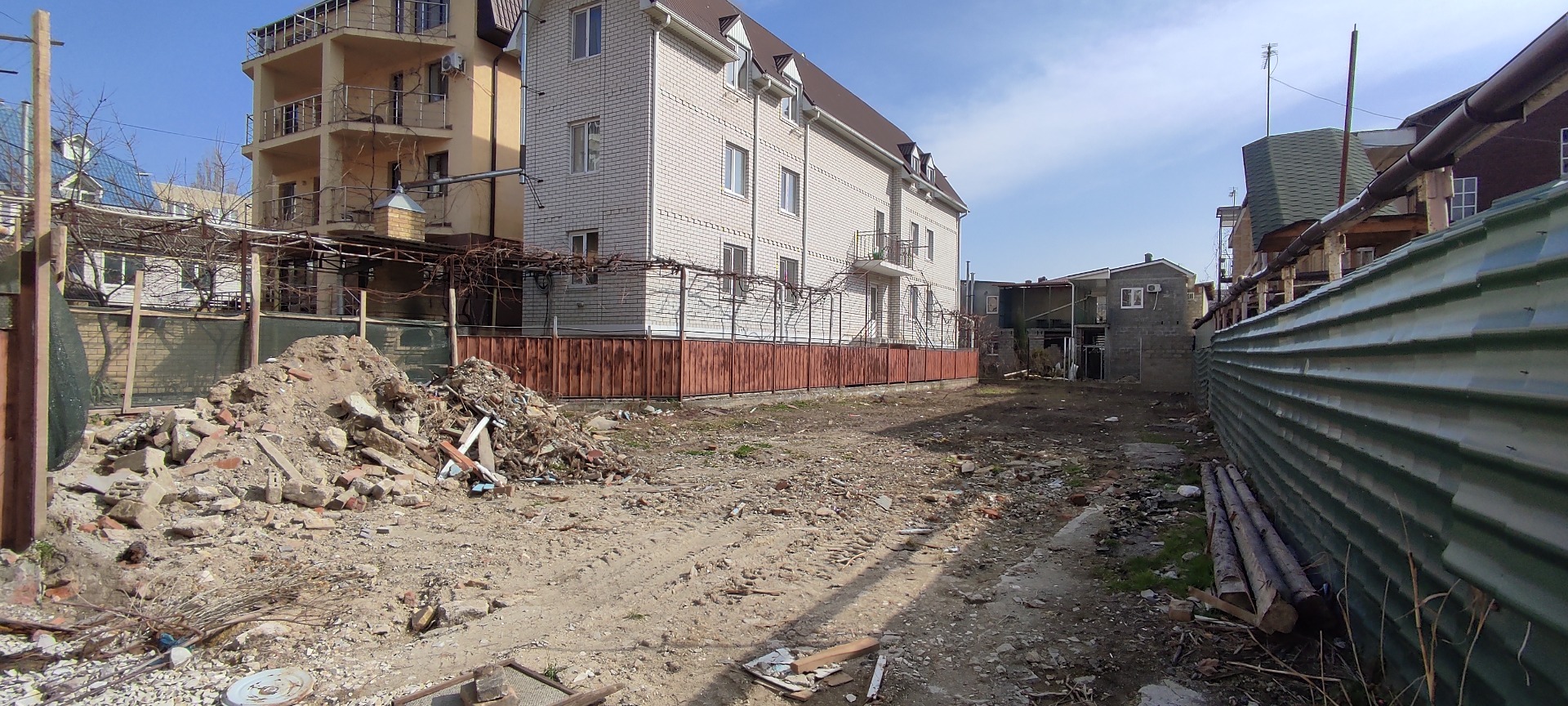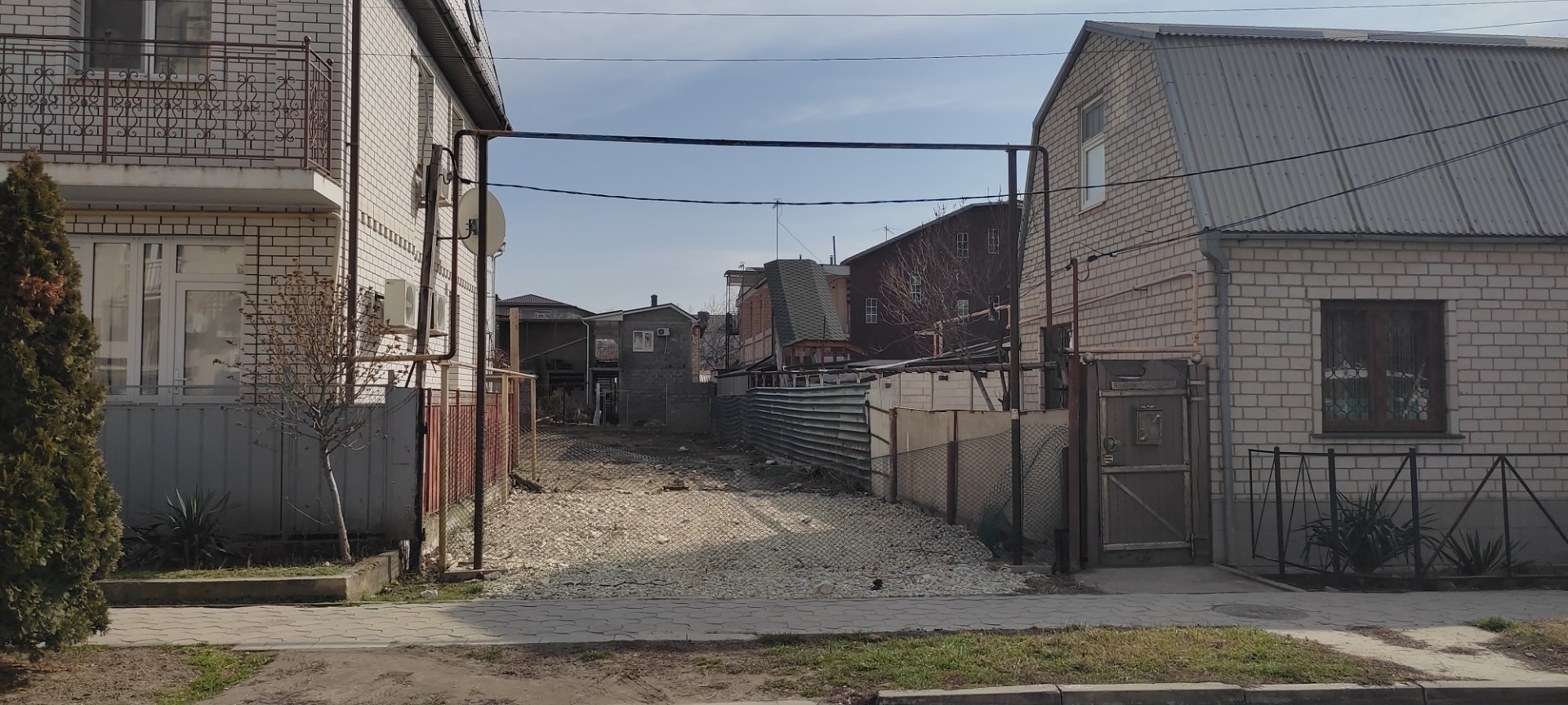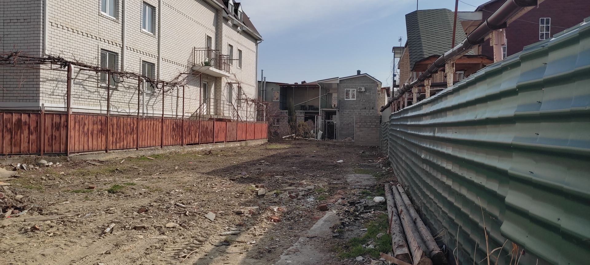 Площадь 5 соток. Фасад 7 метров, в середине участка расшириется до 15 метров. Глубина участка 46 метров.