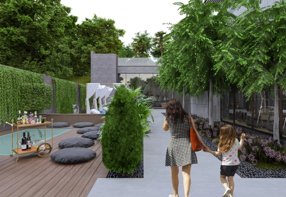 Бассейн, Шезлонги у бассейна, Камелия, Освещение вокруг бассейна, Детская площадка