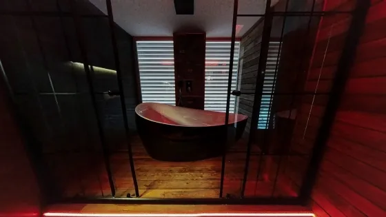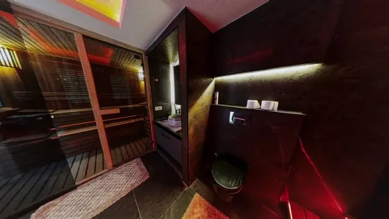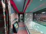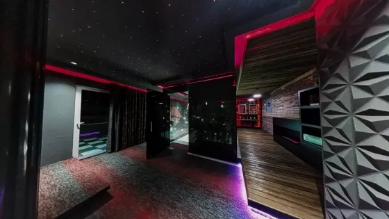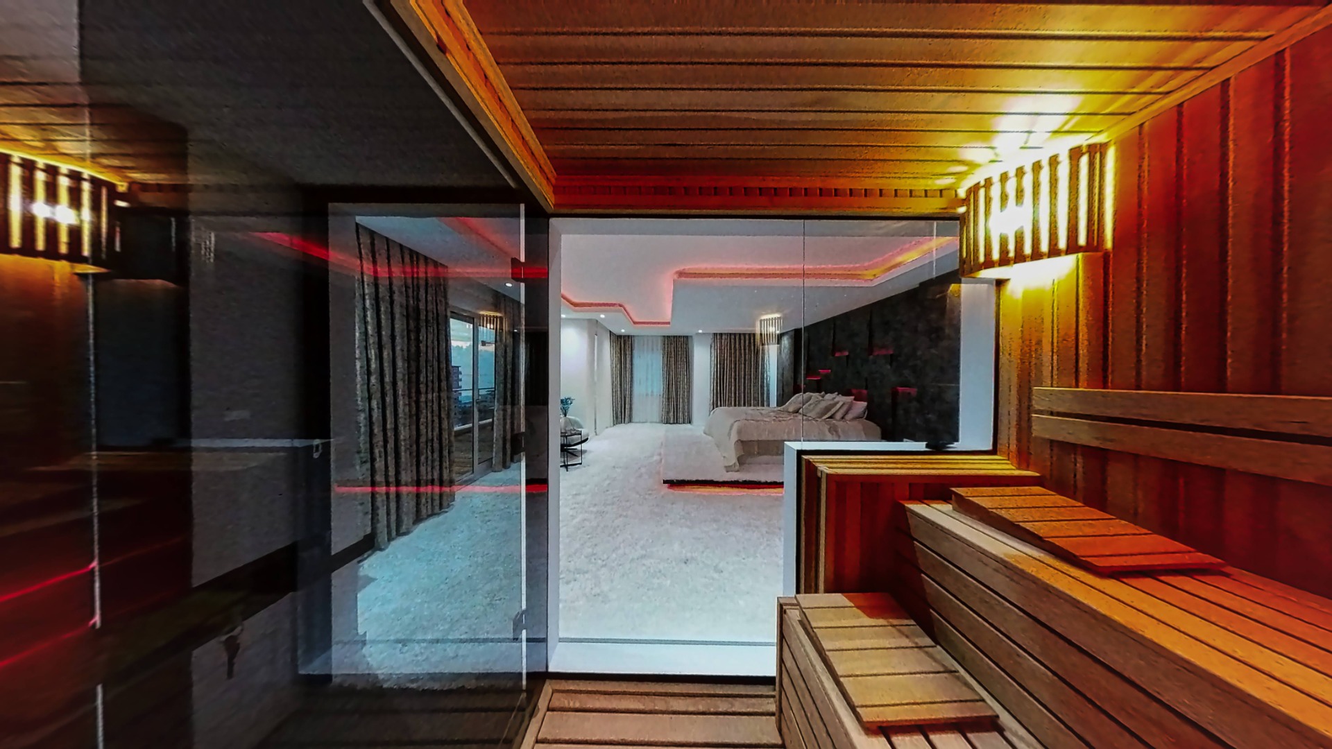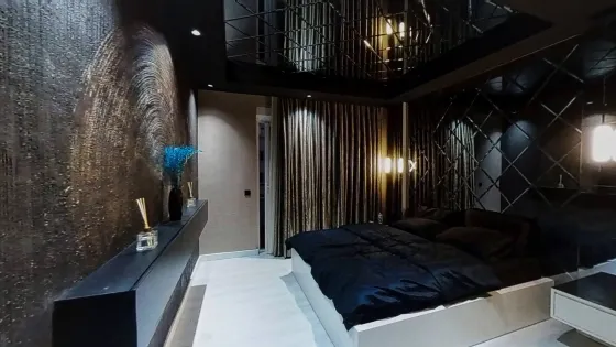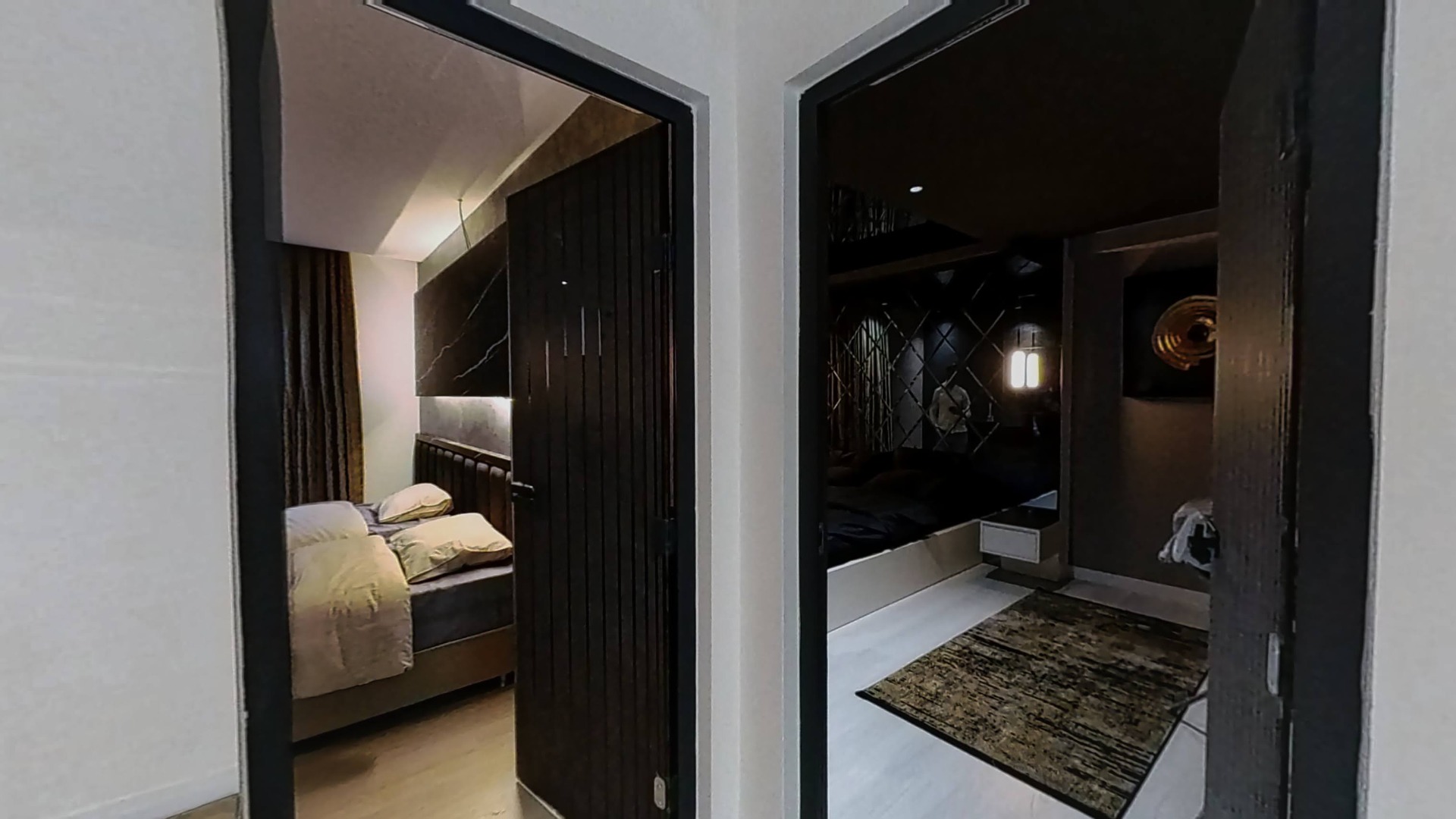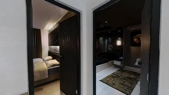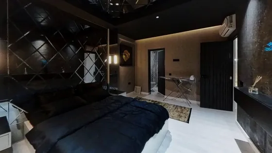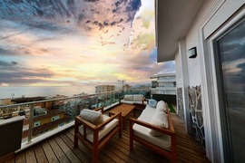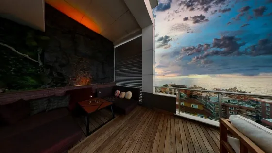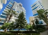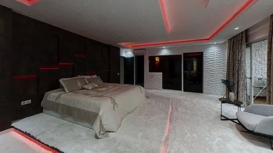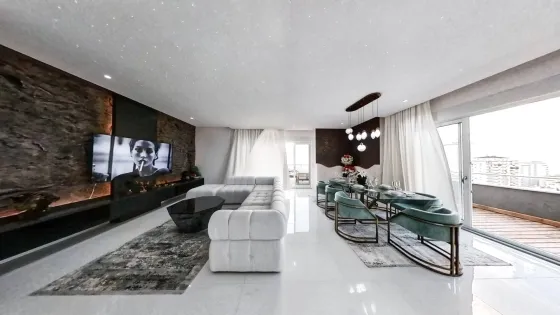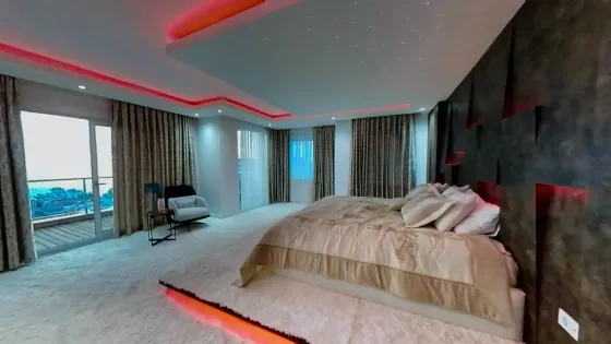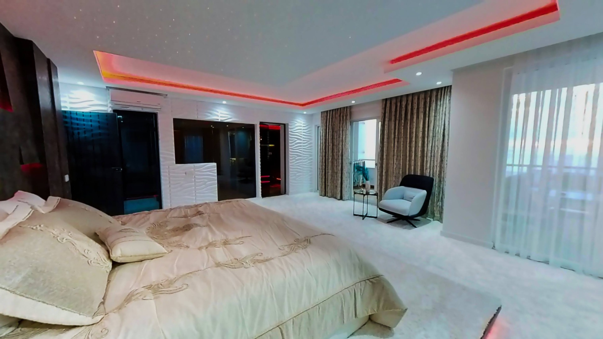 Трехуровневые апартаменты планировки 4+1 площадью 260 кв.м. расположены на 9, 10, 11 этажах и состоят из прихожей, гостиной с американской кухней, четырех спален, трех санузлов, кинотеатра, сауны, четырех балконов и террасы. Квартира укомплектована мебелью и бытовой техникой. Окна квартиры ориентированы на север и запад, вид на Средиземное море. Жилой комплекс 2015 года постройки состоит из двух 11-этажный жилых блоков и находится в конце п. Махмутлар. Расстояние до моря – 100 метров